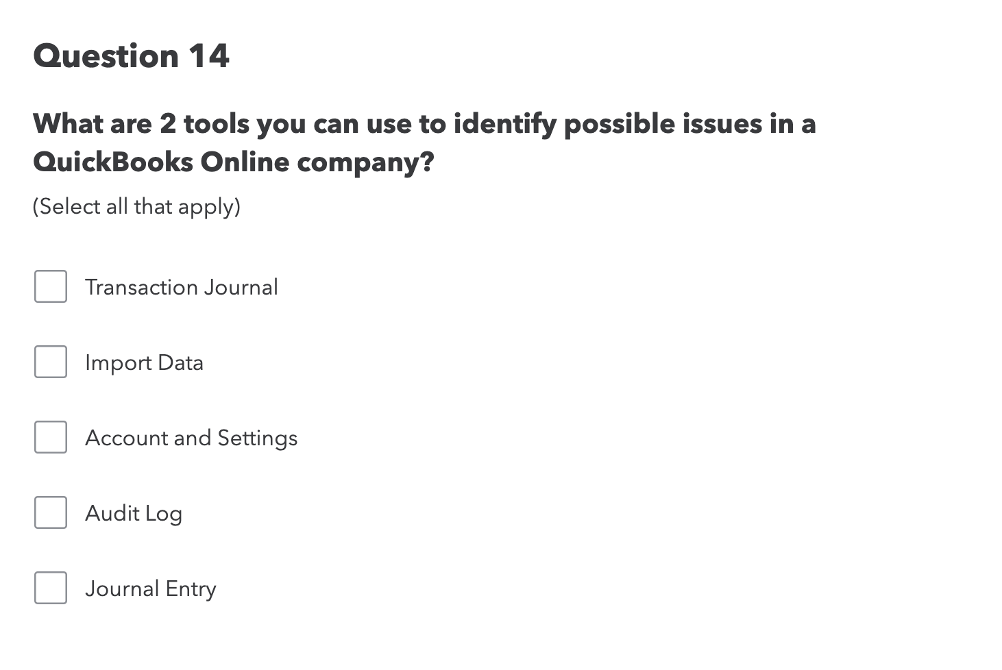 Select Company File Issues if you have an error message when you open your company file or have missing or blank lists. Lynda is teaching her client proper vendor workflow. What are 2 tools you can use to identify possible issues in a QuickBooks Online companySelect all that apply Transaction Journal Import Data Account and Settings Audit Log Journal Entry.